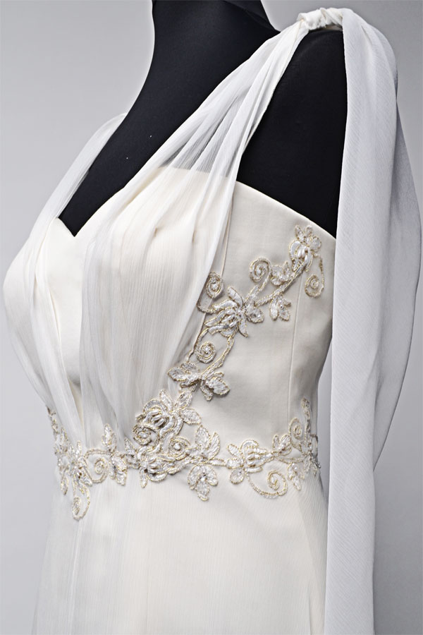 1. Jedwab. Najczęściej wybierany na letnie przyjęcia ślubne. Lekki, naturalny, luksusowy. W moich kolekcjach występuje najczęściej w formie muślinu, organtyny lub satyny (szytej tak, aby matowa strona była na wierzchu).