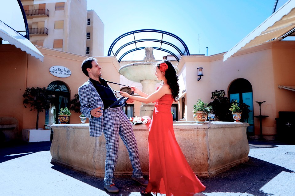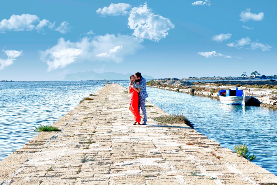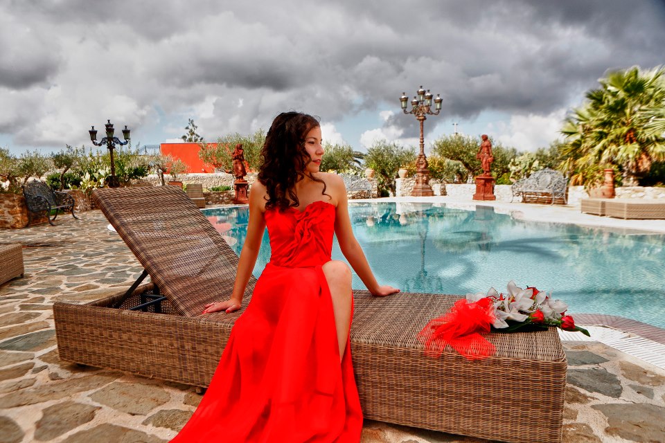 Gorsetowa, krótka baza sukni pokryta została lekkim jak mgła muślinem jedwabnym, który unosił się z każdym powiewem wiatru i przy każdym ruchu, odsłaniając zgrabne nogi. Wszystko dokładnie przemyślałyśmy – bo suknia musiała pięknie komponować się z sycylijskim krajobrazem 🙂