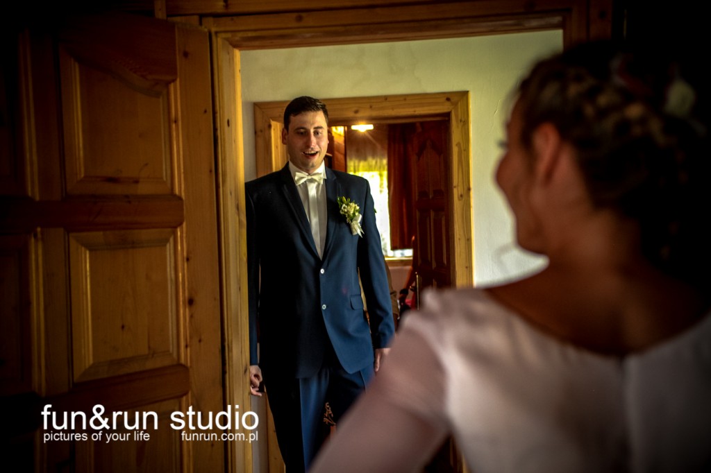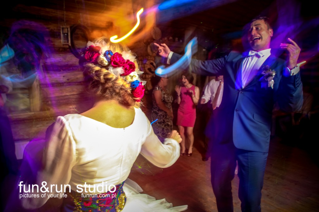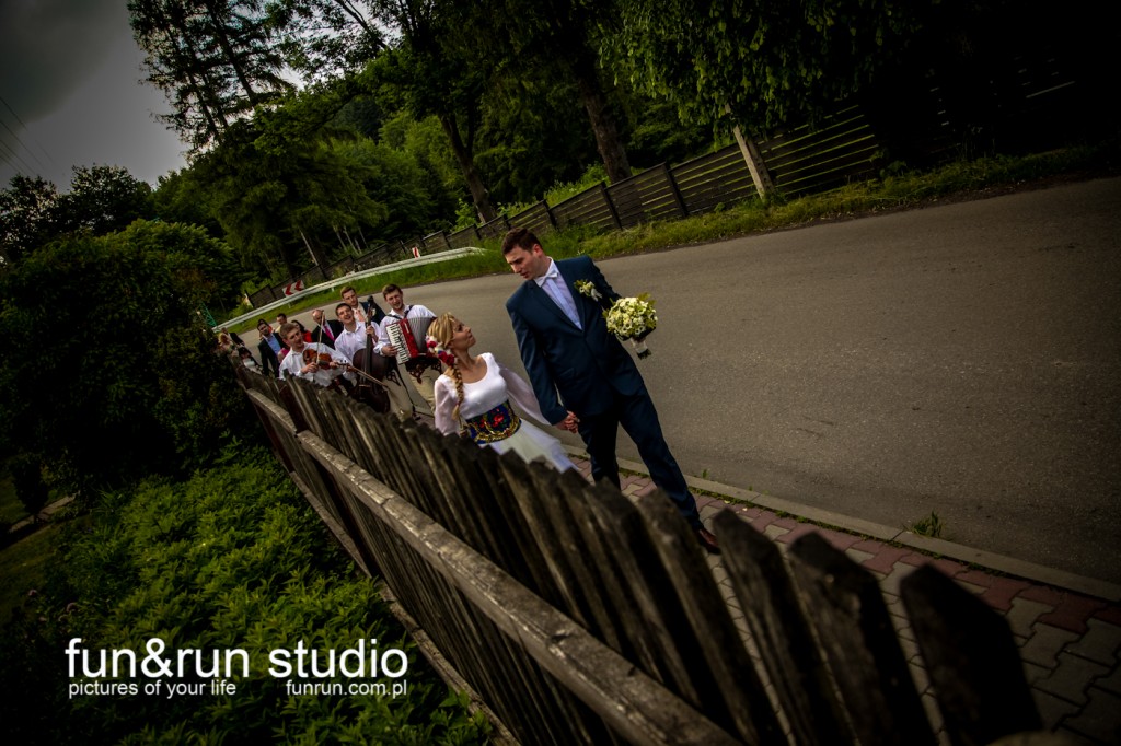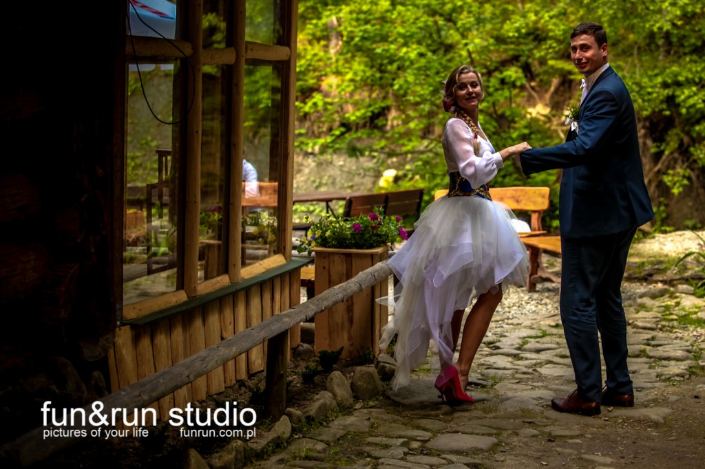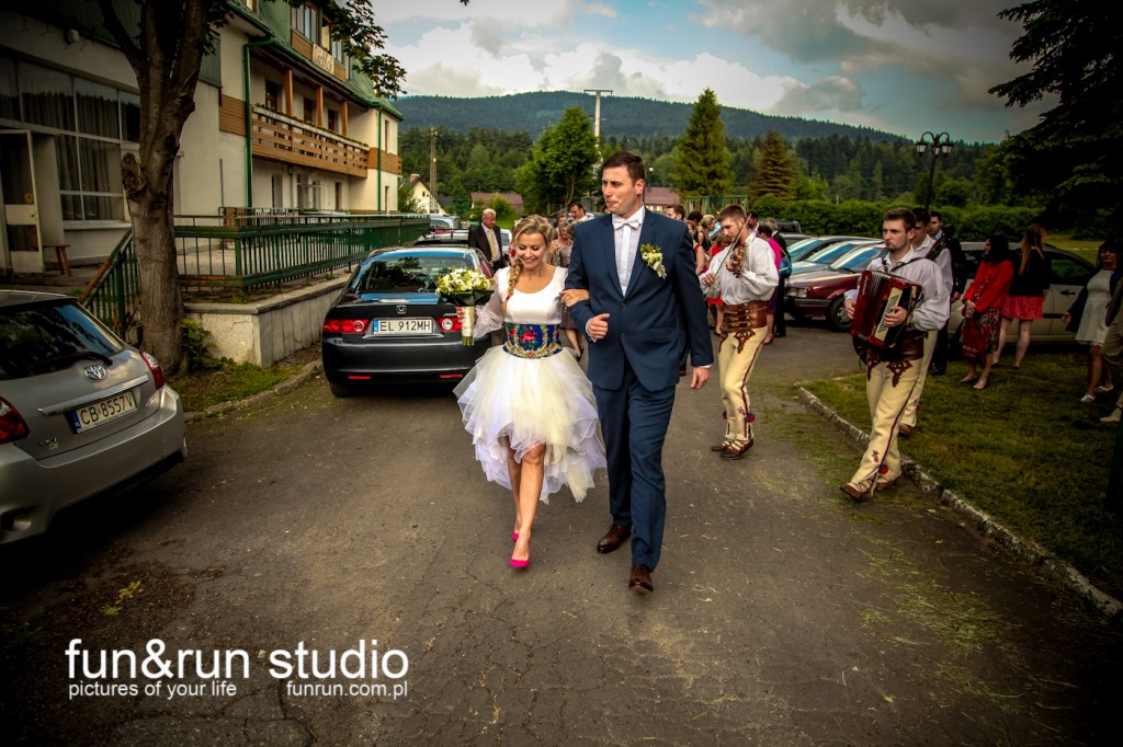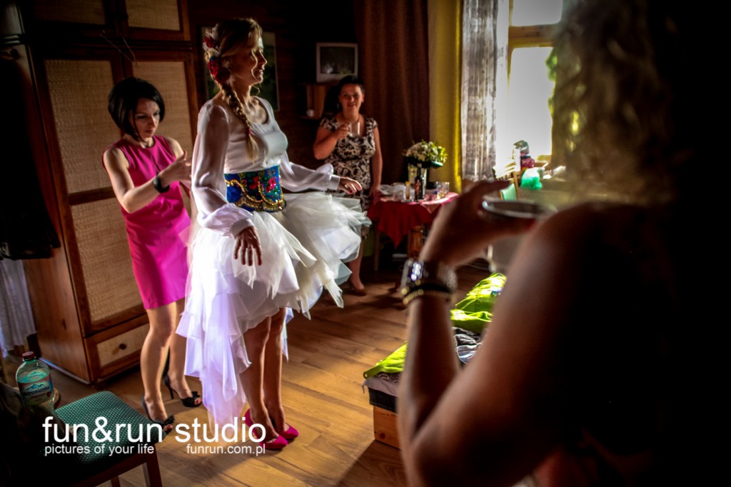 Nietypowe suknie ślubne to moja specjalność!  Zanim przystąpiłam do pracy, poznałam dość dobrze Dominikę, jej charakter i temperament. Pomogło mi to zaprojektować suknię na miarę jej marzeń. A mianowicie suknię z akcentem folkowym, jako że w takim stylu miała się odbyć ceremonia ślubna. Dominika, niegdyś tancerka, potrzebowała sukni wygodnej i niesztampowej – zaproponowałam jej sukienkę „modułową” – jej bazę stanowi jedwabna (muślinowa), klasyczna sukienka z okrągłym, mocno wykrojonym dekoltem i poszerzanymi rękawami zebranymi w mankiet; wierzchnia spódnica z wielu warstw tiulu decyduje o ślubnym charakterze, ale w każdej chwili można ją zdjąć. Oryginalną ozdobę stanowi ręcznie haftowany gorset a całości dopełnia wianek z biżuteryjnych kwiatów.